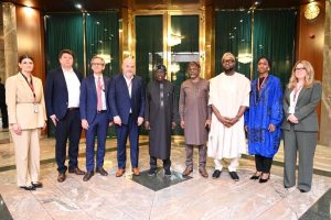 3rd from Left: Danish Ambassador to Nigeria, Jens Bach Hansen; CEO, Bestseller and Chair Bestseller Foundation, Mr Anders Holch Povlsen; President Bola Ahmed Tinubu; Chief of Staff to the President Hon Femi Gbajabiamila, Minister of Communications, Innovation, and Digital Economy, Bosun Tijani, and others at the State House, Abuja. Tuesday, October 28, 2025
