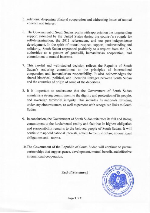 1. The Ministry of Foreign Affairs and International Cooperation wishes to provide the following statement regarding the recent arrival of third-country nationals and one South Sudanese deported from the United States of America to South Sudan.