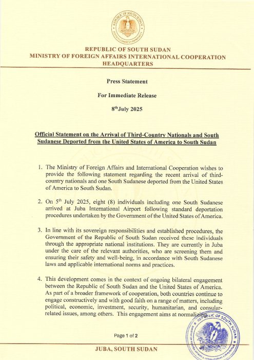 Official Statement on the Arrival of Third-Country Nationals and South Sudanese Deported from the United States of America to South Sudan